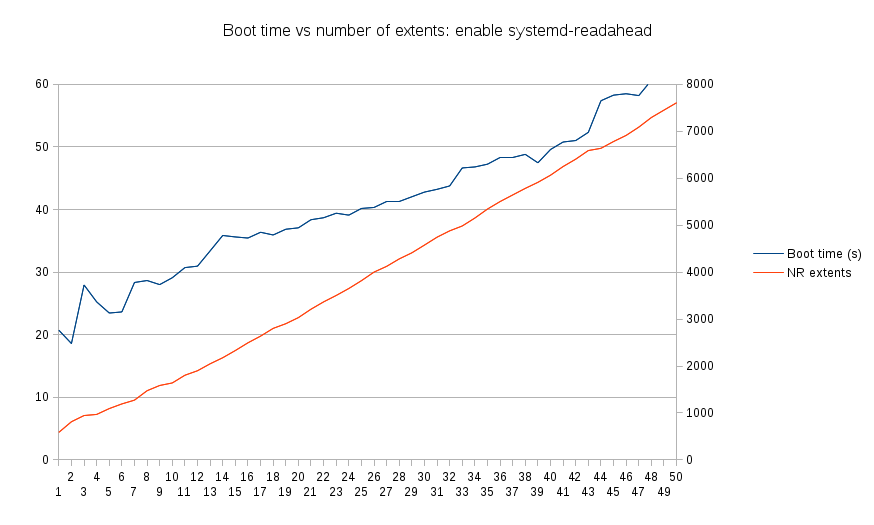 The test was performed doing a defrag before flushing the data to the disk. The number of reboots were 60. The boots times were between 15s and 20s. The number of extents were between 2000 and 3000.